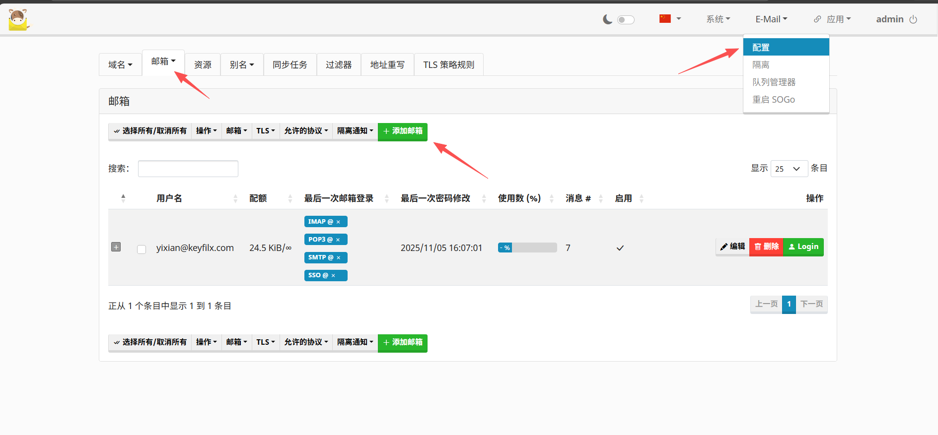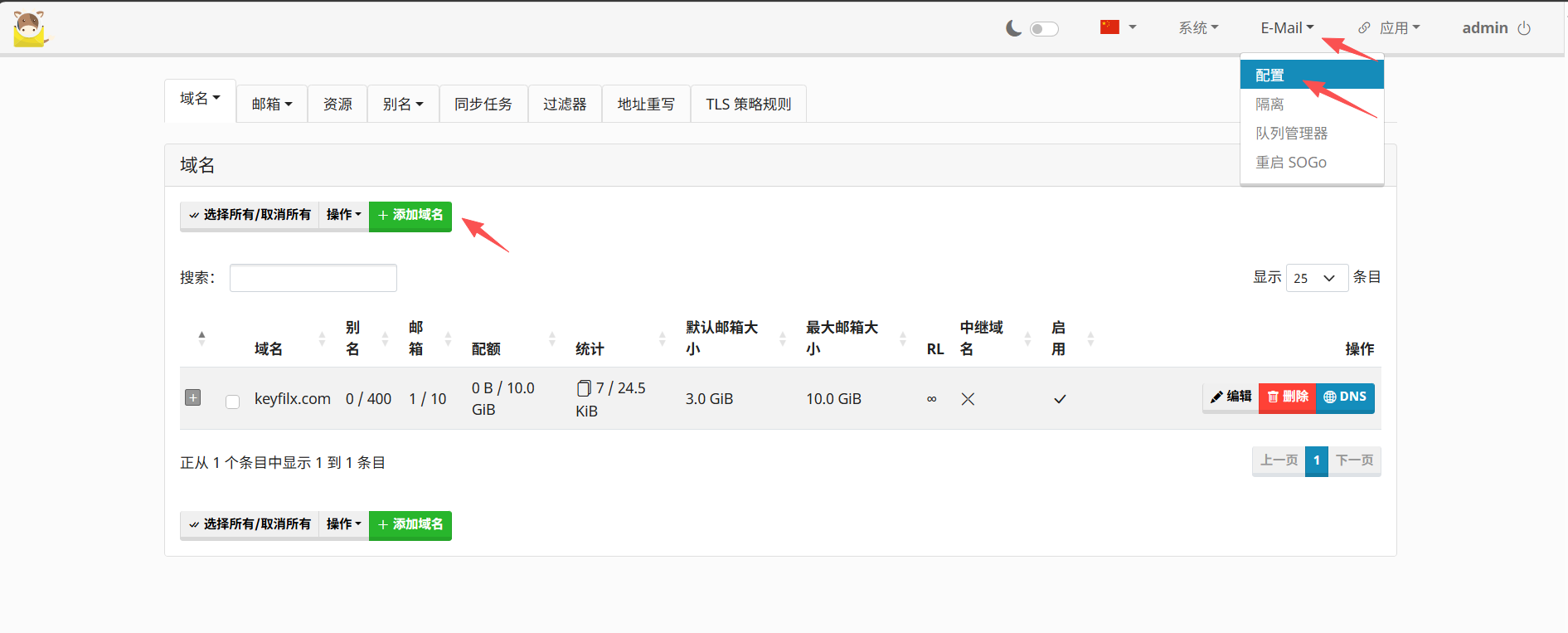 进入 Mailcow 后台后,我们可以在顶部的 E-mail > 配置 里添加域名