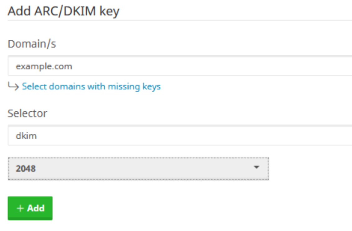 右边那一串 v=DKIM1;k=rsa;t=s;s=email;p= 的 2048 位字符即你的 DKIM 值,如果未开启,可以在下方输入域名,选择 2048 位,然后点 + Add 按钮添加