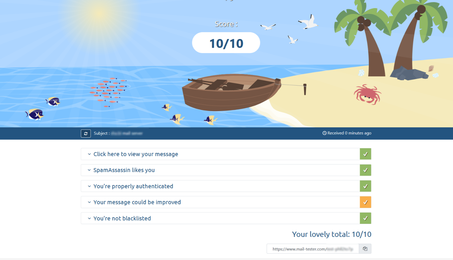 想看邮件分数可以在 mail-tester.com 发送一封 Plain Text 格式的测试邮件,稍等片刻后即可查看你的邮件分数,可以按照他的提示来修改以提高分数,避免发送邮件被放到垃圾邮箱: