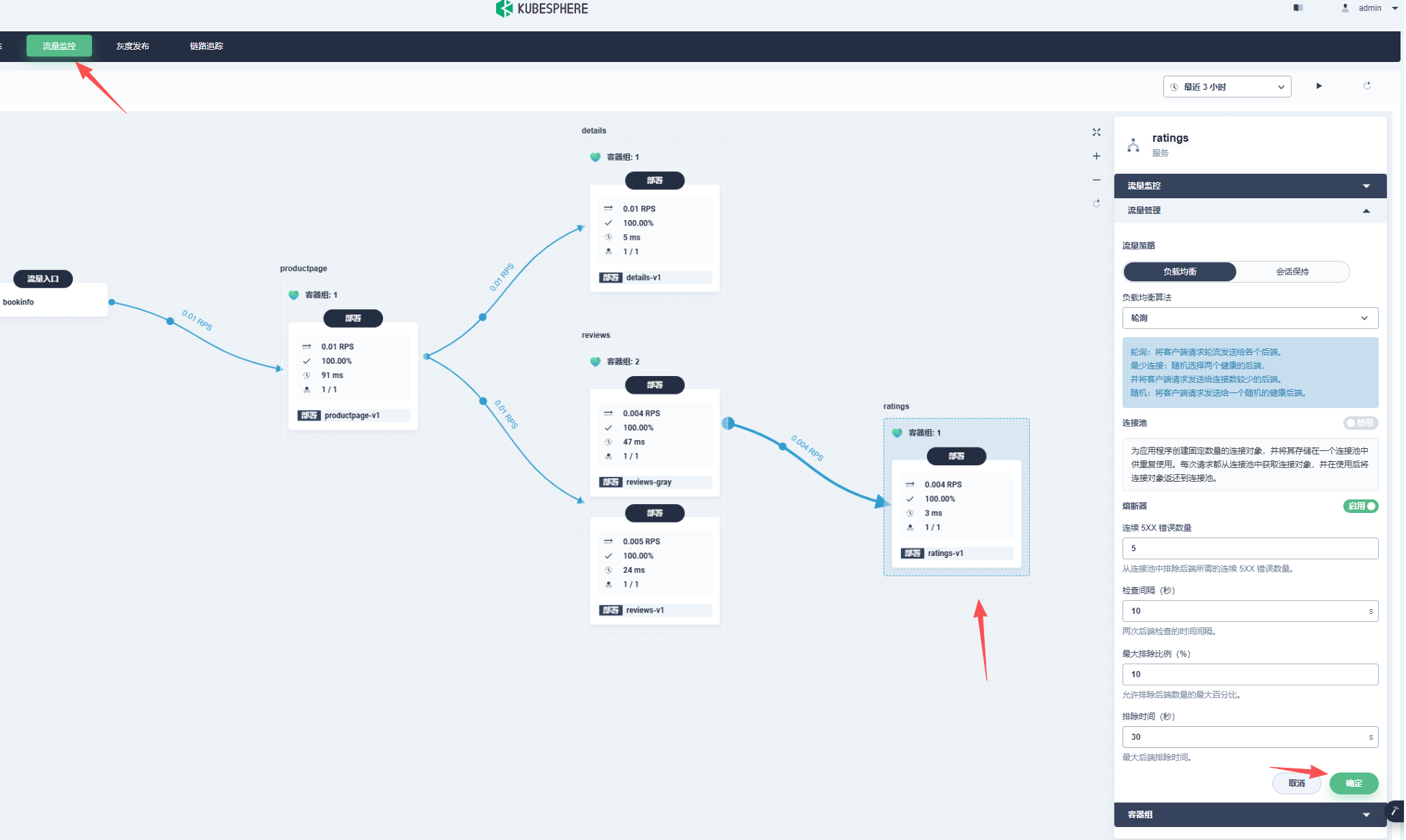 点击具体的微服务,右边有个流量管理,我们点击启用熔断器,确认就可以使用熔断功能,会自动更新相关的VirtualService和DestinationRule: