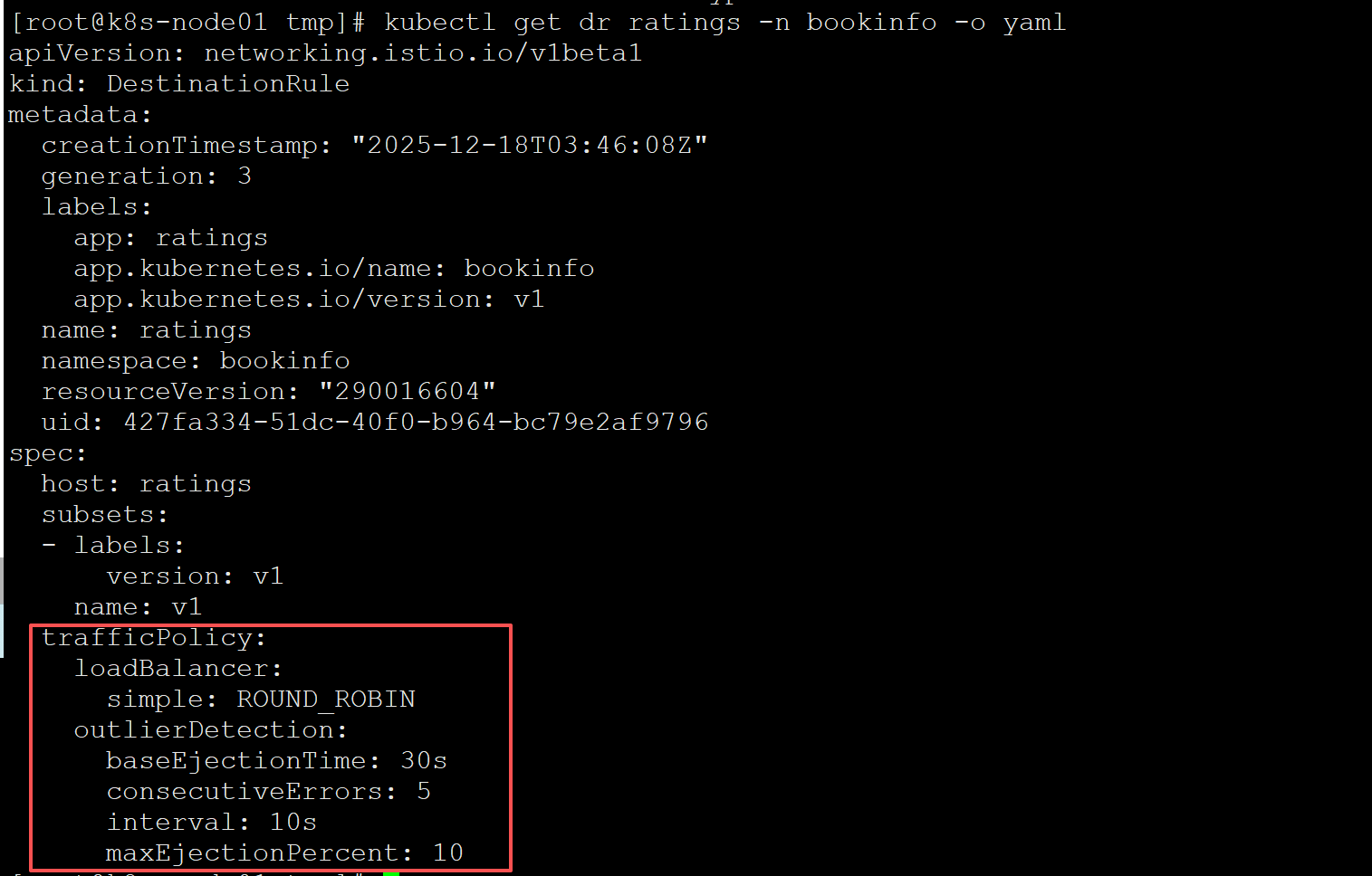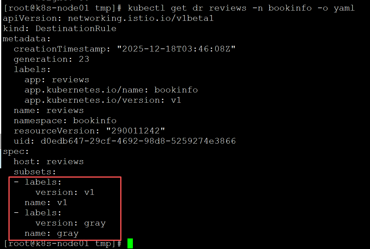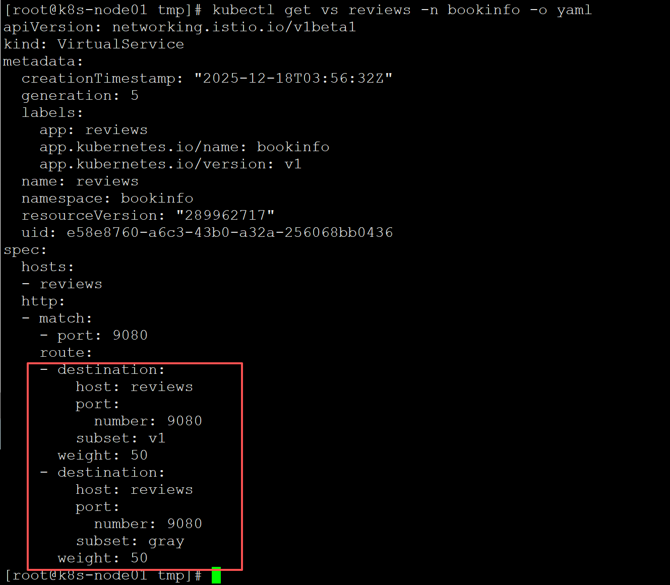 创建完发布任务之后就灰度版本就发布了,VirtualService和DestinationRule会自动调整,可以查看验证一下:
