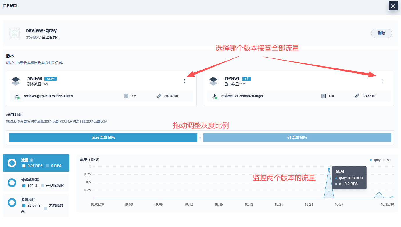 可以点进去查看当前版本和灰度版本的流量,请求成功率等等信息,以及调整灰度比例: